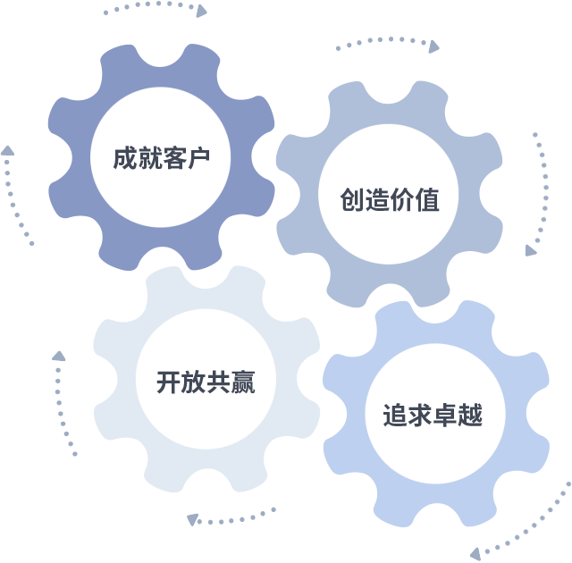 成就客户是一切决策的出发点,,创造价值是衡量所有工作的标准,,,追求卓越是我们做事做人的态度,,,,开放共赢是我们的格局也是最终的结果。。价值观的齿轮环环相扣,,,推动着组织里的每个人不断向前。。。